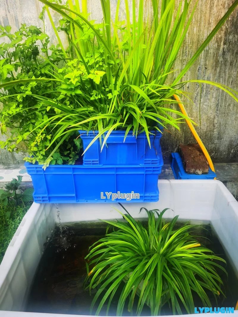 过滤池与鱼池全部是用火山石做沉淀过滤与细菌培养,过滤池是定根种植三款植物水芹菜与水菖蒲与石菖蒲,鱼池是用泡沫板漂浮定植石菖蒲,也是一个乌龟小哂台的作用,龟鱼也不会去咬石菖蒲的叶子。