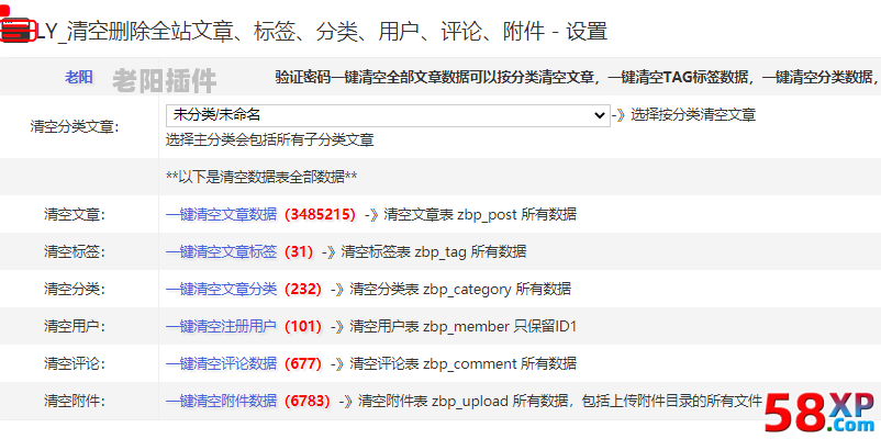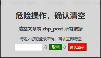 验证密码一键清空全部文章数据可以按分类清空文章,一键清空TAG标签数据,一键清空分类数据,一键清空注册用户,一键清空评论,一键清空图片文件附件,整站文章标签分类都一键清零ID从1开始,重新快速清空删除全部为空站而且其它插件模板后台都不用重新安装设置