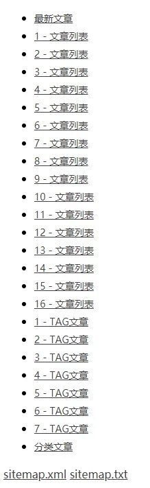 网站地图URL都是动态数据伪静态方式,实时更新不生成实际文件,包含所有分类URL,所有标签URL,生成全站所有文章URL,所有文章列表分页方式每页3000篇文章URL。